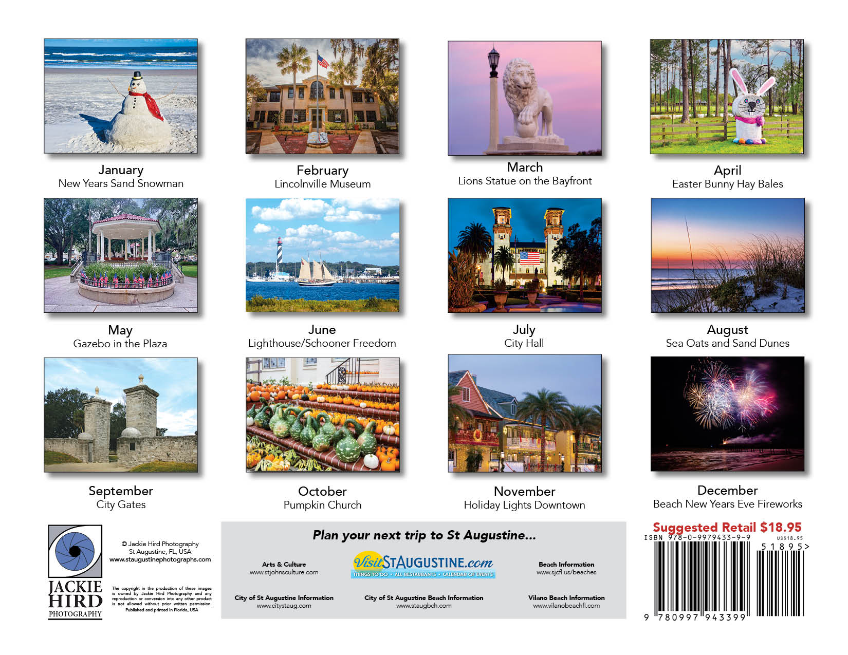 Jackie Hird Photography’s 11th annual St. Augustine wall calendar showcases the city’s historic charm with thirteen full-color photos of iconic landmarks. Large grid squares let you plan appointments, and a 3-month-at-a-glance view keeps your year organized. Includes local events and festivals—perfect for locals, travelers, and anyone who loves Our Nation’s Oldest City.